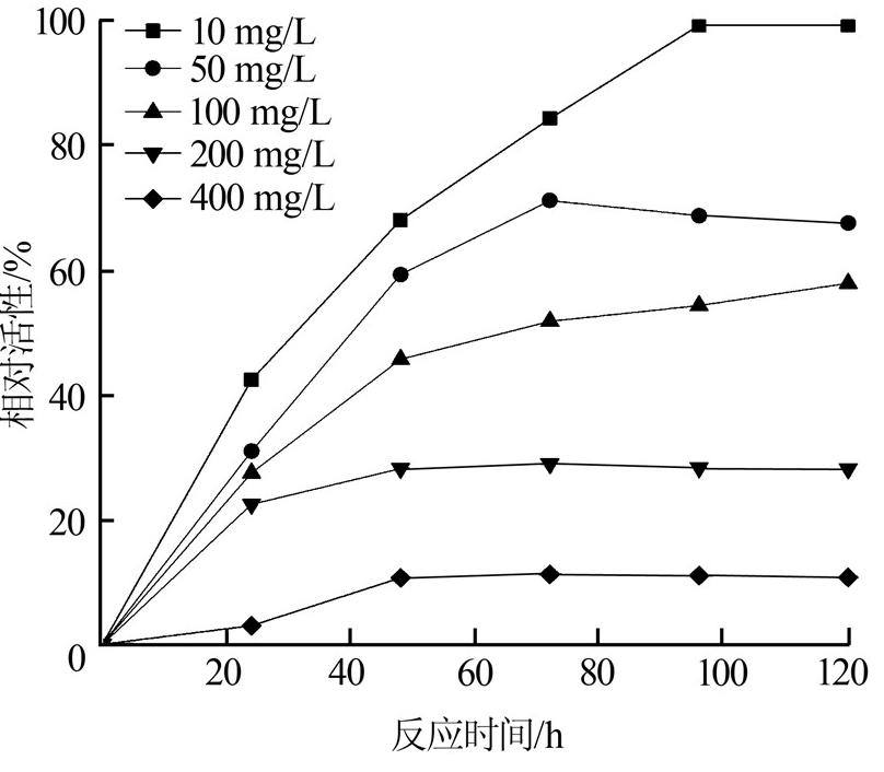 ¡¡¡¡ÔÚ·´Ó¦ÒºCODΪ1 000 mg/L¡¢ÎÛÄàVSSΪ1 500mg/L ¡¢·´Ó¦Î¶ÈΪ35 ¡æ£¬2£¬4-¶þÊå¶¡»ù±½·ÓÖÊÁ¿Å¨¶È·Ö±ðΪ10¡¢50¡¢100¡¢ 200¡¢400 mg/Lʱ£¬¼×ÍéÀۼƲúÁ¿±ä»¯Ç÷ÊÆÈçͼ 2Ëùʾ¡£´Óͼ 2¿ÉÒÔ¿´³ö£¬Í¬Ò»Ê±¿Ì²»Í¬ÖÊÁ¿Å¨¶ÈÊÜÊÔÑùµÄ¼×ÍéÀۼƲúÁ¿Ëæ×ÅÊÜÊÔÎïÖÊÁ¿Å¨¶ÈµÄÔö¼ÓÖð½¥½µµÍ£¬²¢ÇÒ³ý10 mg/LµÄÊÜÊÔÑù¼×ÍéÀۼƲúÁ¿ÔÚµÚ96¡¢120 h½Ó½ü¶ÔÕÕ×éÍ⣬ÆäËûÖÊÁ¿Å¨¶Èϵļ×ÍéÀۼƲúÁ¿¾ùµÍÓÚ¶ÔÕÕÑù£¬ÓÉ´Ë¿´³ö2£¬4-¶þÊå¶¡»ù±½·Ó¶ÔÑáÑõÎÛÄà¾ßÓнÏΪÏÔÖøµÄÒÖÖÆ×÷Óᣲ»Í¬ÖÊÁ¿Å¨¶ÈµÄ2£¬4-¶þÊå¶¡»ù±½·ÓµÄÏà¶Ô²ú¼×Íé»îÐÔÈçͼ 3Ëùʾ¡£
