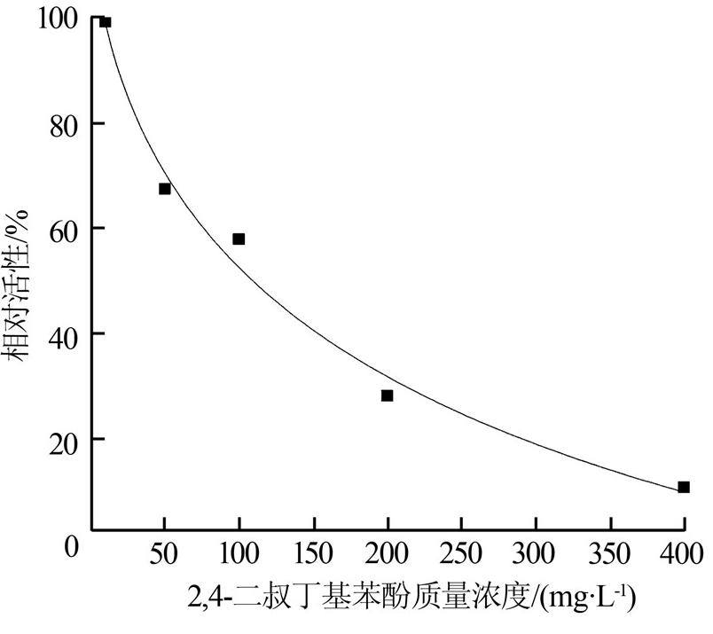 ¡¡¡¡ÊµÑéÊý¾ÝÓÃOrigin 8.5Èí¼þ´¦Àí£¬Í¨¹ýLogisticÄ£ÐÍ·½³Ì¡²10¡³ÄâºÏµÃµ½ÖÊÁ¿Å¨¶È¶ÔÏà¶Ô»îÐÔµÄÇúÏߣ¬¾Ý´ËÀ´¶¨Á¿±íÕ÷2£¬4-¶þÊå¶¡»ù±½·Ó¶ÔÑáÑõ΢ÉúÎïµÄ¶¾ÐÔ£¬²¢½áºÏʽ(1)ÆÀ¼Û²»Í¬ÖÊÁ¿Å¨¶ÈµÄ2£¬4-¶þÊå¶¡»ù±½·Ó¶ÔÑáÑõ΢ÉúÎïµÄÒÖÖÆ³Ì¶È¡£