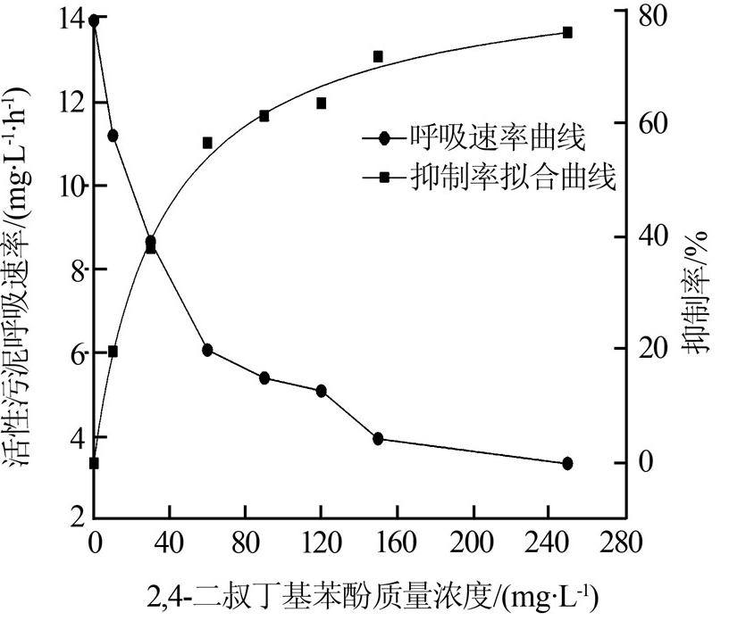 ¡¡¡¡²»Í¬ÖÊÁ¿Å¨¶ÈµÄ2£¬4-¶þÊå¶¡»ù±½·Ó¶Ô»îÐÔÎÛÄà΢ÉúÎïµÄÒÖÖÆÂÊÄâºÏÇúÏß¼ûͼ 5£¬ÇúÏßÄâºÏ·½³ÌΪRin=-88.18/¡²1+(C/37.55)0.96¡³+88.23£¬R2=0.992£¬ÓÉ´Ë·½³Ì¼ÆËã³ö2£¬4-¶þÊå¶¡»ù±½·ÓµÄEC50Ϊ49.61 mg/L¡£µ±2£¬4-¶þÊå¶¡»ù±½·ÓÖÊÁ¿Å¨¶ÈΪ10 mg/Lʱ¶Ô»îÐÔÎÛÄà΢ÉúÎïµÄÒÖÖÆÂʽӽü20%£¬ËµÃ÷2£¬4-¶þÊå¶¡»ù±½·Ó¶ÔºÃÑõÎÛÄà΢ÉúÎïµÄÒÖÖÆ×÷ÓñȽÏÏÔÖø;µ±2£¬4-¶þÊå¶¡»ù±½·ÓΪ10¡«60 mg/Lʱ£¬Æä¶Ô»îÐÔÎÛÄàµÄÒÖÖÆÂʳÊÖ±ÏßÉÏÉý;µ±2£¬4-¶þÊå¶¡»ù±½·ÓÔö¼Óµ½90 mg/Lºó£¬Æä¶Ô»îÐÔÎÛÄàµÄÒÖÖÆÂÊÖð½¥Ç÷ÓÚÆ½»º£¬´ËºóÆä¼ÌÐøÔö¼ÓÖÁ120¡«250 mg/L£¬¶Ô»îÐÔÎÛÄàµÄÒÖÖÆÂÊ»ù±¾Îȶ¨ÔÚ75%×óÓÒ¡£