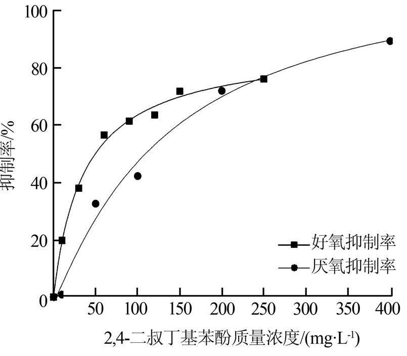 ¡¡¡¡2£¬4-¶þÊå¶¡»ù±½·Ó¶ÔÑáÑõÎÛÄàºÍºÃÑõ»îÐÔÎÛÄà΢ÉúÎïµÄ¶¾ÐÔ´óС²»Í¬£¬Îª±ãÓڱȽÏÁ½Õߵ;ÐÔ×÷ÓÃÇ¿¶È£¬½«²»Í¬ÖÊÁ¿Å¨¶È2£¬4-¶þÊå¶¡»ù±½·ÓµÄÑáÑõºÍºÃÑõÒÖÖÆÂÊ»æÖƳÉͼ 6¡£