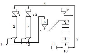 这种操作方式是原水与吸附剂逆流接触,处理水由塔顶流出,再生后的再生剂由塔顶加入。饱和的吸附剂间歇从塔底排出。这种方式可连续进行,适用于较大规模的废水处理。下图是移动床吸附工艺流程。