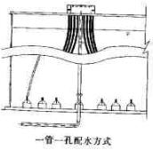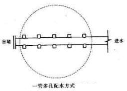 在一根管上均匀布水虽然在理论上是可行的,但在实际中往往是不可实现的,因为这种系统随着时间有些孔口将不可避免发生堵塞。而进水将从没有堵塞的其他孔口重新分配,从而导致在反应器池底的进水分布不均匀,因此应该尽可能避免在一个管上有过多的孔口。目前这种布水方式已较少采用。