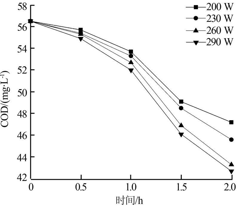 ¡¡¡¡ÔÚÆØÆøÁ¿Îª100 mL/min¡¢pHΪ5¡¢·Åµç¹¦ÂÊ·Ö±ðΪ200¡¢230¡¢260¡¢290 WµÄÌõ¼þ϶ԳõʼÖÊÁ¿Å¨¶ÈΪ20 mg/LµÄDMPÈÜÒº½µ½â2 h£¬Ã¿¸ô0.5 hÈ¡ÑùÒ»´Î£¬²â¶¨ÆäCOD£¬Ñо¿·Åµç¹¦ÂʶÔDMP½µ½âЧ¹ûµÄÓ°Ï죬Èçͼ 3Ëùʾ¡£