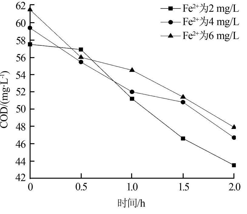 ¡¡¡¡½éÖÊ×èµ²·Åµç¹ý³ÌÖлá²úÉú´óÁ¿µÄH2O2£¬¶øFe2+ÄÜÓëH2O2·¢ÉúFenton·´Ó¦£¬´Ó¶ø²úÉú¸ü¶àµÄ»îÐÔÎïÖÊ£¬Òò´ËʵÑéѡȡFe2+×÷Ϊ´ß»¯¼ÁÑо¿Æä¶ÔDMP½µ½âЧ¹ûµÄÓ°Ïì¡£´ß»¯¼ÁµÄÓÃÁ¿²»Ò˹ý¶à£¬µ÷½ÚFeSO4·Ö±ðΪ2¡¢4¡¢6 mg/L¡£Ôڷŵ繦ÂÊΪ260 W¡¢pH=5¡¢DMP³õʼÖÊÁ¿Å¨¶ÈΪ20 mg/L¡¢ÆØÆøÁ¿Îª100 mL/minµÄÌõ¼þϽµ½â2 h£¬Ã¿¸ô0.5 hÈ¡ÑùÒ»´Î£¬²â¶¨ÆäCOD¡£Fe2+¶ÔDMP½µ½âЧ¹ûµÄÓ°ÏìÈçͼ 5Ëùʾ¡£