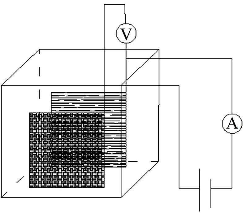 实验选用Ir-Ta-Sn掺杂电极(购自宝鸡智铭特种金属有限公司)作阳极,不锈钢电极作阴极,构成电催化降解实验装置。装置尺寸为 160 mm×150 mm×70 mm,外接可调电源,如图 1所示。