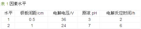设计极板间距(A)、电解电压(B)、原液pH(C)和电解反应时间(D)4因素3水平L9 (34)正交实验表,如表 1所示,实验结果列于表 2。