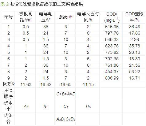 分析表 2发现,原液pH对降解效果的影响最显著,其次是电解电压;各因素对电催化反应的影响顺序为:原液pH>电解电压>极板间距>电催化氧化时间。