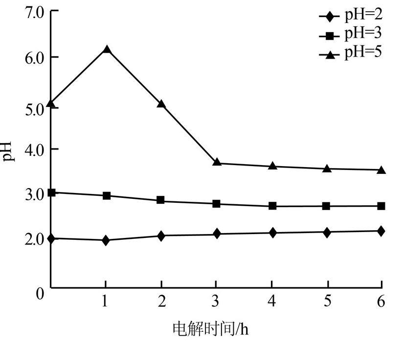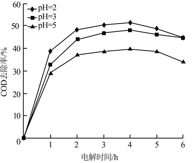 调节pH分别为2、3、5,固定电解电压为24 V、极板间距为1.0 cm,每隔1 h取1次水样,测定电解后渗滤液的COD及pH,结果如图 2和图 3所示。