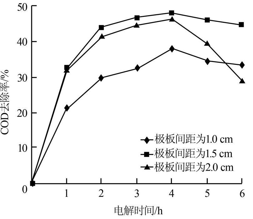 (3)调节极板间距至1.5~2.0 cm对提高垃圾渗滤液的COD去除率有利。过小的极板间距会产生短路现象,过大则会降低去除效果。