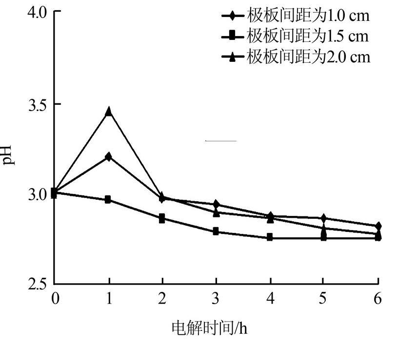 考虑到过高的电解电压对电催化降解的影响不是很显著,且由正交实验结果可知,电解电压为24 V、pH为3时COD去除率最高,因此调整电解电压为24 V、垃圾渗滤液pH为3,分别设置极板间距为1.0、1.5、2.0 cm进行电催化降解实验,每隔1 h取1次水样,电解过程中COD去除率及pH变化情况如图 5、图 6所示。
