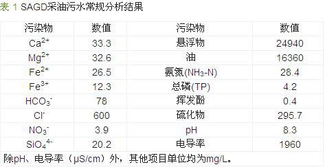 由于受到原油中胶质、沥青质、驱油剂以及地层天然颗粒物等影响,油田采油污水的水质各异且比较复杂,处理难度较大,回注效率低。对SAGD采油污水进行了常规的水质分析,充分了解油田采油污水的水质特性,见表 1。