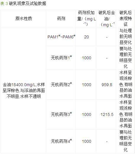 (1)破乳剂的筛选。因SAGD采油污水乳化稳定性较强,试验选取PAM1#~PAM6# 以及无机药剂1#~4#来筛选破乳剂。在破乳温度为65 ℃、停留时间为1 h时,根据水样表观特征及部分试验数据选择高效药剂,结果如表 3所示。