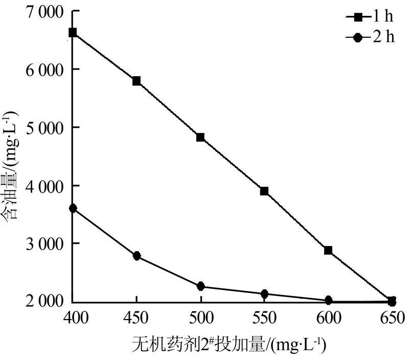 当停留时间为2 h、无机药剂2#投加量为500 mg/L时,处理后水样含油可降至2 258.6 mg/L,与停留时间为1 h、药剂投加量为650 mg/L的破乳效果相当,如图 2所示。当停留时间为2 h,药剂投加量<500 mg/L时,破乳后水样含油量上升迅速。为减少药剂的用量,最优选择为无机药剂2#、停留时间为2 h。