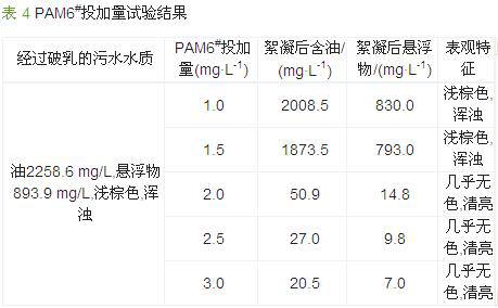 由表 4可见,当PAM6#投加量在2 mg/L以下时,絮凝效果一般;投加量达到2 mg/L后,水样絮凝效果明显,小油珠及悬浮物迅速上浮,水样变得清亮;当投加量达到2.5 mg/L时,絮凝后水样含油27.0 mg/L,悬浮物为9.8 mg/L,根据油田采油污水回注水控制标准(悬浮固体 < 10.0 mg/L,油 < 30 mg/L),达到了油田回注水的水质标准要求。。