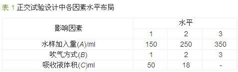 (2)水样加入量、吹气方式、吸收液用量的选定。水样加入量、吹气方式、吸收液用量为酸化吹气仪设定的主要条件,通过SPSS19.0软件设计正交试验,并对试验结果进行数据分析,以选出最优的吹脱捕集条件。吹脱捕集过程中3个主要影响因子:水样加入量会影响吹气速率和瓶内上方气流方向从而影响回收率,吸收液用量会影响硫化物吸收的完全与否,这2个因素直接影响硫化物的富集效率,另外相较于单流量吹气方式,载气流量分步加大会得到更好的回收率〔6〕。同时考虑到自配仪器的容量——500 mL圆底烧瓶和2种不同规格的吸收瓶,在将水样加入量、吹气方式及吸收液体积作为3个影响因子的同时,前2个因子分别设3个水平、后1个因子设2个水平,设计混合型正交试验,见表 1。