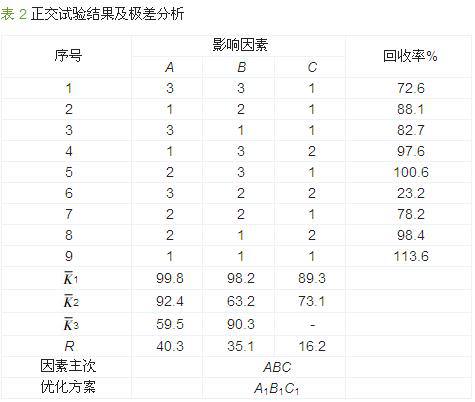 从表 2可以看出,因子A水样加入量的R值较大,即加入水量的多少会显著影响回收率,其中 1> 2> 3,故水样加入量优先选择150 mL;B因子对测定也有一定影响,由于 1> 3> 2吹气方式选1;C因子对回收率的影响相对较弱,因 1> 2,吸收液量选取50 mL。按极差分析得出的优化方案为A1B1C1即第9组试验,其回收率为113.6%>>100%,可推测其受外界干扰因素较多,不符合优化条件的选择。由于显著影响因子A的水平1、2的 相差较小,并且实验发现组合为A2B1C1时平均回收率为99.7%(n=6,RSD=5.63%),综合考虑后选取A2B1C1为最优条件。