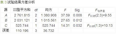 从表 3发现,显著性检验Sig.值均远<0.05,在0.05的显著性水平上各因素均会对回收率产生影响。各水平的F值均>F临界值,各因素影响的显著性A>B>C,与极差分析相符。运用软件进行因素A的各水平比较,水平1、2间Sig.值为0.233>0.10,水平1、3间Sig.值为0.004,水平2、3间Sig.值为0.007,所以在水平1、2间作选择符合要求。