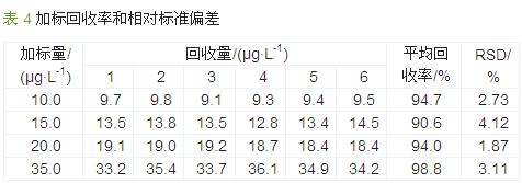 (2)精密度实验。对不同浓度的标准溶液进行吹脱捕集前处理,随后进离子色谱检测,每个水平做6次平行实验,样品的回收率良好,平均回收率均>90%,且各平行相对标准偏差均不超过5%,重现性良好,结果见表 4。