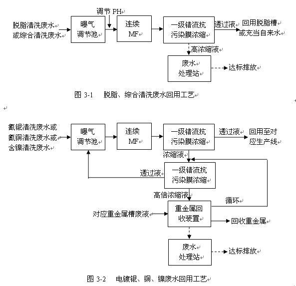 ¶Ôͼ3-1˵Ã÷£¬ÍÑÖ¬ÇåÏ´·ÏË®Óë×ÛºÏÇåÏ´·ÏË®·Ö±ðÊÕ¼¯µ¥¶À»ØÊÕÀûÓã¬ÍÑÖ¬·ÏË®ÖÐÖ÷Òªº¬ÓÐÉÙÁ¿ÍÑÖ¬¼Á¼°¼«ÉÙÁ¿µÄÓÍÖ¬£¬ÏÔ¼îÐÔ£¬Ë®ÖÐÐü¸¡¼°½ºÌåÎïºÜÉÙ¡£·ÏË®¾¹ýPHµ÷½Úºó£¬½øÈëÁ¬ÐøÎ¢¿×¹ýÂË×°Öã¬À¹½Ø½ÏСÐü¸¡Îï¡¢½ºÌ塢ϸ¾ú΢ÉúÎï¼°¶þ´ÎÎÛȾ´øÈëµÄÔÓÖʵȣ¬Á¬Ðø MF¾ßÓÐ×Ô¶¯ÔËÐС¢³åÏ´¹¦ÄÜ£»MF͸¹ýÒº½øÈëĤŨËõϵͳ£¬Ö÷ÒªÊÇÍѳý·ÏˮˮÖÐÑηݣ¬¸ÃĤԪ¼þÊǸù¾Ýµç¶Æ·ÏË®µÄÌØÐÔ£¬²ÉÓÃÁ¬Ðø´íÁ÷¿¹ÎÛȾ¼¼Êõ£¬ÍÑÖ¬²¿·Ö͸¹ýÒº»ØÓÃÖÁµç¶ÆÏßÍÑÖ¬²Û£»×ۺϷÏˮ͸¹ýÒº¿É³äµ±×ÔÀ´Ë®»ò½øÒ»²½ÖƳɸߴ¿Ë®Ê¹Óã¬Á½ÕßŨËõ·ÏË®¿ÉÖ±½ÓÈ¥·Ïˮվ×ۺϴ¦Àíϵͳ½øÐд¦Àí¡£