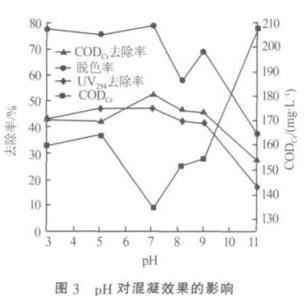 ¡¡¡¡(1 ) ¸´ ºÏ »ì Äý ¼Á µÄ ×î ¼Ñ ¸´ ºÏ Åä ±È Îª 0.12 mL/L Ë«Çè°·ÍÑÉ«¼Á+87.5 mg/L PAC£¬ÔÚ pH=7 ÏÂͬʱͶ¼Ó PAC ºÍË«Çè°·ÍÑÉ«¼Á,ÒÔ 200 r/min ¿ìËÙ½Á°è 30 s£¬ÔÙÒÔ 45 r/min ÂýËÙ½Á°è 10 min£¬³Áµí 45 min£¬»ìÄý´¦Àíºó CODCr È¥³ýÂÊ¡¢ ÍÑÉ«ÂÊ ¡¢UV254 È¥³ýÂÊ·Ö±ð´ïµ½ 57.70%¡¢74.73%¡¢36.50%¡£