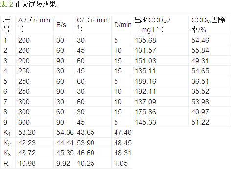 ¡¡¡¡ÒÔ CODCr È¥³ýÂÊΪ¿¼²ìÖ¸±ê£¬Ñ¡È¡¿ìËÙ½Á°èËÙ¶È (A )¡¢ ¿ì ËÙ ½Á °è ʱ ¼ä (B)¡¢ Âý ËÙ ½Á °è ËÙ ¶È (C)¡¢ ÂýËÙ½Á°èʱ¼ä (D) ΪӰÏìÒòËØ £¬½øÐÐËÄÒòËØÈýˮƽµÄ L9(34)Õý½»ÊÔÑé¡£ ÒòËØË®Æ½µÄѡȡ²Î¿¼ÁËǰÆÚµ¥ÒòËØÊÔÑéµÄ½á¹û£¬¸÷ÒòËØË®Æ½¼û±í 1 £¬ÊÔÑé½á¹û¼û±í 2¡£