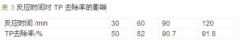 ¡¡¡¡Óɱí 3¿ÉÖª £¬Ëæ×Å·´Ó¦Ê±¼äµÄÔö¼Ó £¬TP È¥³ýÂʲ»¶ÏÉý¸ß£¬µ«³¬¹ý 90 min ʱ £¬Ñõ»¯¼Á»ù±¾·´Ó¦ÍêÈ« £¬ TP È¥³ýÂÊÔö¼Ó»ºÂý¡£ Ñ¡Ôñ·´Ó¦Ê±¼äΪ 90 min£¬´Ëʱ³öË® TP Ϊ 37.2 mg/L¡£