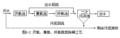 以去除污水中BOD的同时达到脱氮除磷目的的城市污水处理流程有水解(酸化)-好氧生物处理工艺,A1/A2/O流程即厌氧-兼氧-好氧生物处理工艺,如图6-2所示。