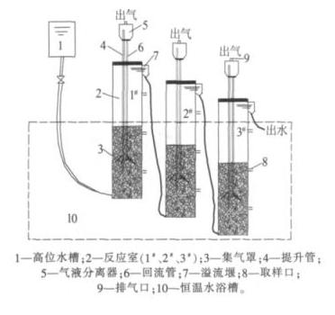 试验装置如图 1 所示 ,MICR 由 3 根 D 80 mm× 1 000 mm 的有机玻璃管串联而成,总有效容积为 12.81 L,分为 1#、2#、3# 反应室。各反应室均设 3 个孔径为 8 mm 的取样口,取样口分别位于距离 反应室底部 100、350、700 mm 处,并用恒温水浴槽控制试验温度为(35±1 ) ℃。 废水从高位槽向 1# 反应室底部注入,然后由上部出水口经溢流堰顺管道进入 2# 反应室底部,依次推进,经过 3# 反应室之后排出 。各反应室的气体在集气罩下方汇集,以泥水混合液的形式经提升管进入气液分离器,气体从排气口排出,泥水混合液经回流管回流至反应室底部,形成液体内部循环 。