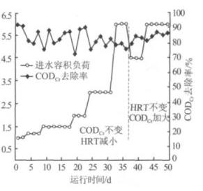 经过近 40 d 的培养驯化,当进水 CODCr 为 1 100 mg/L,HRT 为 24 h 时 ,CODCr 去 除 率 稳 定 在 92% 左右,进入运行特性试验阶段,该过程分 2 个阶段提高进水容积负荷 。 CODCr 去除率随进水容积 负荷的变化情况见图 2。