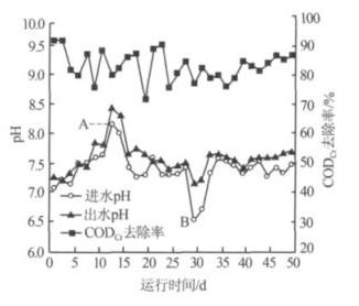 图 3 进、出水 pH 及 CODCr 去除率随运行时间的变化