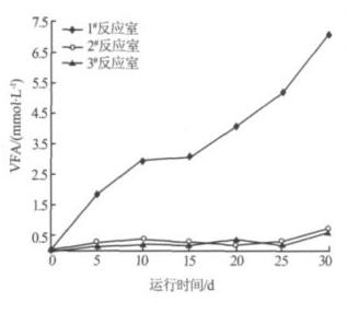 在厌氧消化过程中 ,甲烷菌主要利用 VFA 形成甲烷,因此 VFA 的积累程度及变化规律能够很好地表征厌氧反应器的相分离状态〔6〕。图 5 为各反应室出水的 VFA 随运行时间的变化情况。