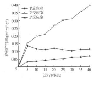 由图 6 可见,2# 反应室产生的 CH4 最多,容积产气率 >0.153 m3/(m3· d),最高达 0.397 m3/(m3· d),并随着容积负荷的 增加而增大 ( 随运行时间延长容积负荷增加 ),表明 2# 反应室以产甲烷菌为主。 1# 反应室产生的 CH4 量受进水容积负 荷的影响不大 ,总体保持在 0.103~ 0.137 m3/(m3· d) 的水平 ,表明 1# 反应室主要起水解和酸化作用 ,以产酸菌为主,产甲烷菌的活性受到抑制 ,而且受进水容积负荷的直接冲击,CH4 产量呈现小幅度的波动 。 3# 反应室与 2# 反应室一样 ,产 CH4 量随着容积负荷的增加而增大 ,但 产 CH4 量 始 终 很 低 ,其 容 积 产 气 率 最 大 为 0.071 m3/(m3· d),表明 3# 反应室也以产甲烷菌为主 ,但由于废水流至 3# 反应室时剩余的有机物很少 ,底物不足,因此 CH4 量很少 。。