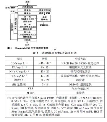 HA-A/ A-MCO ¹¤ÒÕÁ÷³Ì¼ûͼ1¡£¸Ã¹¤ÒÕÓÉË®½âËữ³Ø¡¢ÑáÑõÊÍÁ׳ء¢È±Ñõ³Ø¡¢¶à¼¶´®Áª½Ó´¥ÆØÆø³Ø¡¢¶þ³Á³Ø¡¢²àÁ÷³ýÁ׳غÍѧ³ýÁ׳Ø×é³É¡£·´Ó¦×°ÖÃÓÃPVC ²ÄÁÏÖÆ×÷, ÆäÖÐË®½âËữ³ØÓÐЧÈÝ»ýΪ60 L,HRT Ϊ2. 5 h; ÑáÑõ³ØºÍȱÑõ³ØÓÐЧÈÝ»ý¾ùΪ30 L,HRT ¾ùΪ1. 5 h; ¶à¼¶´®Áª½Ó´¥ÆØÆø³Ø·Ö³ÉÏà¶Ô¶ÀÁ¢µÄÈý¸ñ: µÚÒ»¸ñϸ¾ú·ÖÉ¢ÅàÑøÇøÓÐЧÈÝ»ýΪ15 L, HRT Ϊ0. 5 h¡« 0. 75 h; µÚ¶þ¸ñÔÉú¶¯ÎïÉú³¤ÇøÓÐЧÈÝ»ýΪ30 L, HRT Ϊ1. 5 h; µÚÈý¸ñºóÉú¶¯ÎïÉú³¤ÇøÓÐЧÈÝ»ýΪ40 L, HRT Ϊ2 h; ¶à¼¶´®Áª½Ó´¥ÆØÆø