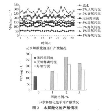 ´Óͼ2 ¿´³ö, ÔÚϵͳÎȶ¨ÔËÐÐÒ»¸öÔµIJâÊÔÆÚ¼ä, ÎÞÂÛ»ØÁ÷ºÃÑõÎÛÄ໹ÊÇÑáÑõÊÍÁ×ÎÛÄà½øÐÐË®½âËữ, ¾ùÄÜʹˮ½â³Ø³öË®VFA ×ÜÁ¿Ôö¼Ó, ÇÒ¾ù½ÏÎÞÎÛÄà»ØÁ÷ʱ³öË®VFA ÖµÒª¸ß, Õâ±íÃ÷ÎÛÄà»ØÁ÷, Ë®½â³ØÓлúÖÊÔö¼Ó, ÓÐÀûÓÚVFA µÄ²úÉú; ͬʱ, ÓÉÓÚ»îÐÔÎÛÄàÖк¬Óи÷ÀàË®½âø, ÇÒË®½âøµÄ»îÐÔ²¢²»Êܵç×ÓÊÜÌåµÄÓ°Ïì, Òò´Ë, ½«ÎÛÄà»ØÁ÷ÖÁË®½â³ØÓÐÀûÓÚÄѽµ½âÓлúÎïµÄË®½â, ´Ó¶øÌá¸ßÁËVFA µÄ²úÁ¿¡£