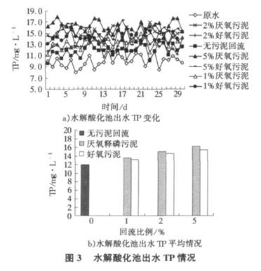 ´Óͼ3 ¿ÉÒÔ¿´³ö, »ØÁ÷ÎÛÄà¾Ë®½âËữºó, ʹ΢ÉúÎïϸ°ûÄÚÍâµÄ¾ÛÁ×ËáÑνâÌå²¢²»¶ÏÊͷųöÀ´, µ¼ÖÂË®½â³Ø³öË®TP Ôö¼Ó, ÇÒËæ»ØÁ÷±ÈµÄÔö´ó¶øÔö´ó¡£ÑáÑõÊÍÁ×ÎÛÄà»ØÁ÷ʹˮ½â³ØÖгöË®TPÓÉ13. 6 mg/ L( »ØÁ÷±È1%) Ôö´óÖÁ16. 3 mg/ L( »ØÁ÷±È5%) ; ºÃÑõÎÛÄà»ØÁ÷TP ÔòÓÉ13. 2 mg / L( »ØÁ÷±È1%) Ôö´óÖÁ15. 4 mg / L( »ØÁ÷±È5%) ¡£²¢ÇÒ, ͬ»ØÁ÷±ÈÏÂ, ÑáÑõÊÍÁ×ÎÛÄà»ØÁ÷±ÈºÃÑõÎÛÄà»ØÁ÷ʱˮ½â³Ø³öË®TP ´ó, ÇÒËæ×Å»ØÁ÷±ÈµÄÔö´ó, Æä²îÖµÔö´ó¡£ÕâÊÇÓÉÓÚÎÛË®´¦ÀíϵͳÖлîÐÔÎÛÄàÁ¿½öÕ¼»ìºÏÒº±ÈÀýµÄ1% ×óÓÒ, Òò´Ë, »ØÁ÷ÎÛÄà( Ô¼º¬99%µÄË®) Öеĺ¬Á×Á¿½üËÆµÈÓÚÎÛË®Öеĺ¬Á×Á¿¡£¹Ê»ØÁ÷ÑáÑõÊÍÁ×ÎÛÄà±È»ØÁ÷ºÃÑõÎüÁ×ÎÛÄຬÁ×Á¿Òª¸ß¡£