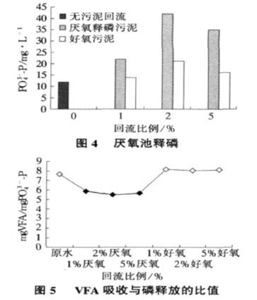 ÓÉͼ4 ½áºÏͼ2 ¿ÉÖª, ÎÞÂÛÊÇ»ØÁ÷Ë®½âÑáÑõÊÍÁ×ÎÛÄ໹ÊǺÃÑõÎÛÄà, Ïà½ÏÎÞÎÛÄà»ØÁ÷, ÆäVFA Ôö¶à, ÑáÑõ³ØPO3-4 P Ũ¶ÈÒ²ÔÚÔö¼Ó, ÓÈÆäÊǵ±ÑáÑõÊÍÁ×ÎÛÄà»ØÁ÷±ÈΪ2%ʱ, ÑáÑõ³ØPO3-4 PŨ¶È×î´ó, ¾ùÖµ´ïµ½57 mg/ L¡£Îª±£³ÖϵͳÁׯ½ºâ, ÅÅÈ뻯ѧ³ýÁ׳صÄÑáÑõ¸»Á×ÎÛË®µÄÁ¿Ëæ×ÅPO3-4 P µÄÔö¼Ó¶ø¼õÉÙ, »¯Ñ§¹ÌÁ×ÎÛË®Á¿µÄ¼õÉÙÒ²»áµ¼ÖÂϵͳÔËÐзÑÓýµµÍ, Òò´Ë, ±¾ÏµÍ³ÓÅÑ¡»ØÁ÷Ë®½â2%ÑáÑõÊÍÁ×ÎÛÄà¡£½áºÏͼ2b) , ͼ3b) ºÍͼ4 µÄÊÔÑé½á¹û»¹¿ÉÒÔ·¢ÏÖ, 2%ÑáÑõÊÍÁ×ÎÛÄà»ØÁ÷, ÑáÑõÓÐЧÊÍÁ×Á¿¾ùֵΪ42 mg/ L, 275 mg / L µÄVFA¾ÀúÑáÑõ¶ÎºóÓà44 mg/ L, ÑáÑõ¶ÎÏûºÄ231 mg/ L, ¼´Ã¿ÊÍ·Å1 mgÁ×ÐèÎüÊÕ5. 5 mg VFA¡£ÆäËû¹¤¿öÈçͼ5 Ëùʾ¡£