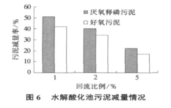 ÓÉͼ6 Öª, ²»ÂÛÊÇÑáÑõÊÍÁ×ÎÛÄ໹ÊǺÃÑõÎÛÄà»ØÁ÷µ½Ë®½â³Ø¾ùÄܵõ½Ò»¶¨³Ì¶ÈµÄ½µ½â, ´ïµ½ÎÛÄà¼õÁ¿Ð§¹û, ÇÒÎÛÄà¼õÁ¿ÂʾùËæÓÉͼ6 Öª, ²»ÂÛÊÇÑáÑõÊÍÁ×ÎÛÄ໹ÊǺÃÑõÎÛÄà»ØÁ÷µ½Ë®½â³Ø¾ùÄܵõ½Ò»¶¨³Ì¶ÈµÄ½µ½â, ´ïµ½ÎÛÄà¼õÁ¿Ð§¹û, ÇÒÎÛÄà¼õÁ¿ÂʾùËæÎÛÄà»ØÁ÷±ÈÀýµÄÔö¼Ó¶ø¼õÉÙ¡£ÒÔÑáÑõÊÍÁ×ÎÛÄàΪÀý, ÎÛÄà¼õÁ¿ÂÊÓÉ50%( »ØÁ÷±È1%) ½µÖÁ40%( »ØÁ÷±È2%) ¡£·ÖÎöÔÒòΪ: ÎÛÄàË®½âËữ´Ùʹˮ½â³ØÖÐÈܽâÐÔCOD( SCOD) Ôö¶à, SCOD µÄÔö¼Óµ¼ÖÂVFA ²úÁ¿Ôö¼Ó, Òò´Ë, VFA ²úÉúÁ¿ÓëÎÛÄàË®½âµÄÁ¿³ÉÕýÏà¹Ø¡£µ±»ØÁ÷ÑáÑõÊÍÁ×ÎÛÄàʱ, 1%»ØÁ÷±ÈÌõ¼þϵÄÎÛÄà»ØÁ÷×ÜÁ¿ÊÇ2% ʱµÄ50%, ¶ø1%( 158 mg/ L) »ØÁ÷±ÈÌõ¼þÏÂVFA ²úÁ¿Îª2%( 275 mg/ L) ʱµÄ58% ( ¿ÉÒÔÀí½âΪÎÛÄàË®½âÁ¿µÄ±ÈÖµ) ¡£Òò´Ë, 1%±È2%ʱµÄË®½âËữÎÛÄà¼õÁ¿ÂÊÒª¸ß¡£¡£