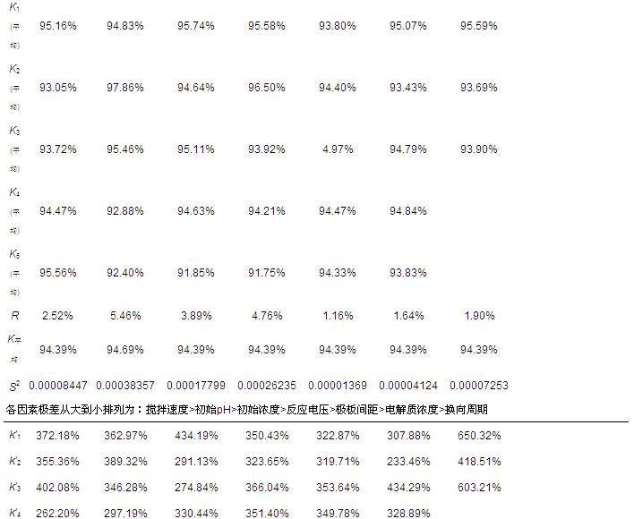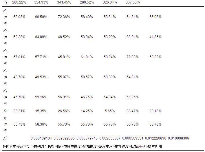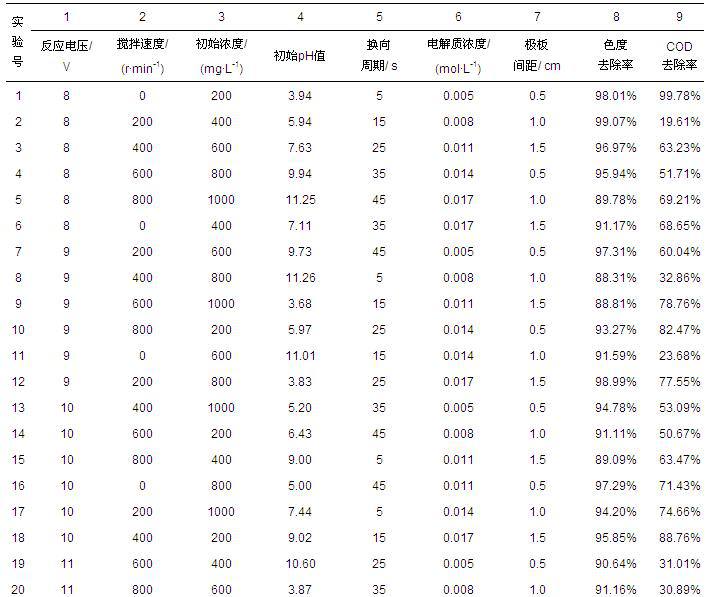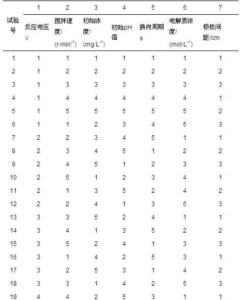 为了确定处理过程中各项影响因素对处理结果的影响,首先开展了正交试验,据此确定采用该方法处理活性艳蓝X-BR模拟染料废水的最佳反应条件.处理过程中所涉及到的反应条件主要有反应电压、搅拌速度、添加电解质(Na2SO4)浓度、极板间距、模拟废水初始浓度、换向周期、废水初始pH值以及反应时间等.经前期探索实验可知,处理效果在反应初期会随着反应时间的延长而提高,一般会在20~25 min时达到最大值,之后5~10 min左右基本保持不变,超过30~35 min后少部分条件实验处理效果会略有下降,据分析应是部分被凝聚上浮的絮体发生溶解返回到废水中所致,因此选择的正交试验表见表 1,各因素和其水平见表 2.