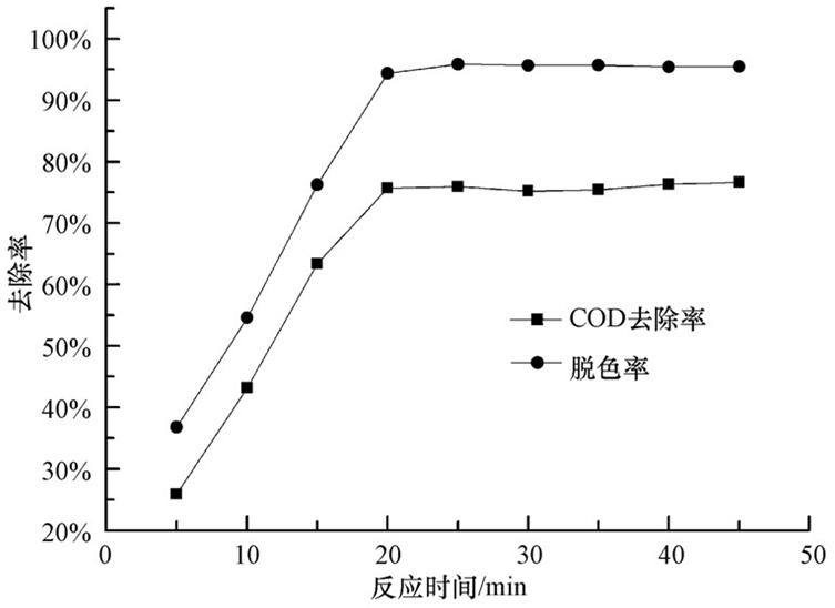 从图 2可以看出,在此条件下从20 min开始处理效果即趋于稳定,经20 min处理后模拟废水脱色率最高可达95%以上,COD去除率最高可达75%左右.