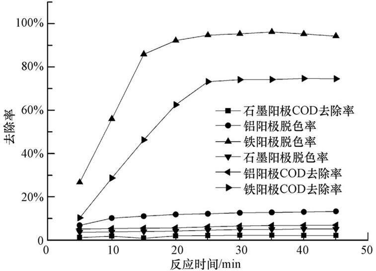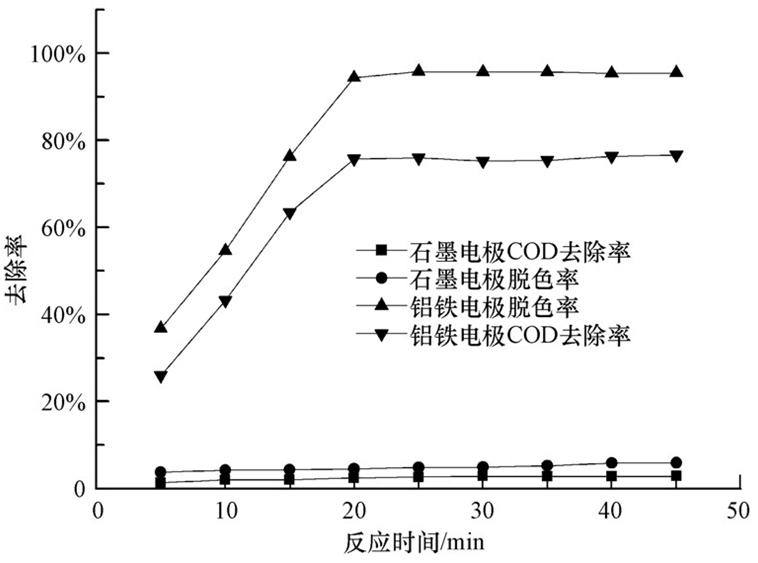 考虑到石墨作为阳极材料时不会出现溶解现象,也不会产生有絮凝作用的金属离子,可以藉此判断废水净化的主导作用究竟是电化学氧化还原还是电凝聚作用,因此将其作为电极与铝和铁阳极处理过程进行对比,设计实验方案如下:分别采用同种尺寸的石墨、铝和铁作为阳极,铁作为阴极,模拟染料废水浓度均为200 mg · L-1,反应电压10 V,搅拌速度200 r · min-1,pH值不变,极板间距0.5 cm,添加电解质Na2SO4浓度为0.011 mol · L-1,直流定向电源处理模拟废水,去除效果见图 5.