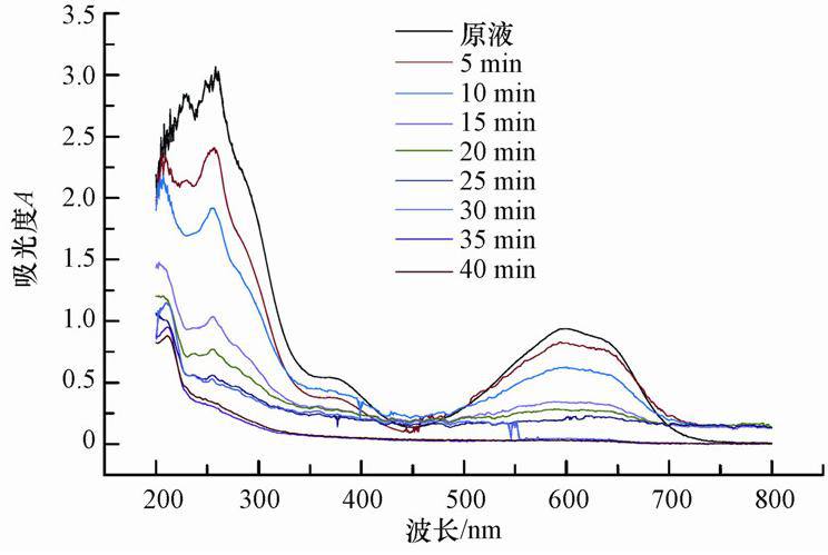 根据上述分析可知,本研究所涉及模拟废水处理过程中,电凝聚是使色度降低COD得到去除的主导作用,但是否同时也存在一定程度的电化学氧化还原作用尚需进一步确定.为此,在获得的最佳反应条件下分别对不同反应时间后的废水离心取样,在200~800 nm 波长范围内定性扫描不同时间的反应产物,其 UV-Vis 图谱如图 7所示.