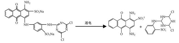 首先活性艳蓝X-BR分子在电流作用下断裂生成了1,4-二氨基蒽醌-2-磺酸根,由于醌醌有共轭不饱和酮的性质,可发生亲电加成反应,因此,1,4-二氨基蒽醌-2-磺酸根有可能又在氢原子和铁的催化作用下发生了氢的亲电加成反应,生成二元酚而脱色;另外由于1,4-二氨基蒽醌-2-磺酸根也有颜色,而处理后模拟废水脱色率接近100%,因此也有可能直接被絮凝沉降或上浮,推测的具体断裂过程见图 11.
