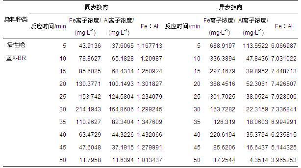 在获得同步换向方式最佳处理条件后,采用ICP方法测试处理后模拟废水中铝离子和铁离子浓度,结果见表 4.