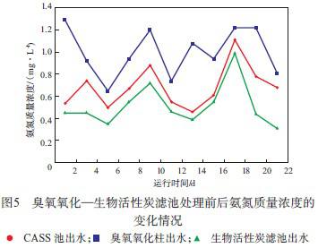 臭氧氧化—生物活性炭滤池处理前后氨氮质量浓度的变化情况见图 5。由图 5 可见:CASS池出水的平均氨氮质量浓度为 0.68 mg/L,经臭氧氧化后平均氨氮质量浓度为 1.00 mg/L,不仅没有下降,反而有所升高,上升约 46.3%。原因可能在于:臭氧能把水中的有机氮和蛋白性氮氧化为氨氮,同时氨氮的化学稳定性较强,不易与臭氧反应,从而引起氨氮质量浓度升高[16]。由图 5 还可见:臭氧氧化柱出水经生物活性炭滤池降解后平均氨氮质量浓度降至 0.51 mg/L,生物活性炭滤池的平均氨氮去除率为 48.5%;系统平均总氨氮去除率为 24.7%。上述结果表明,氨氮的去除主要依靠生物活性炭的生物氧化作用。