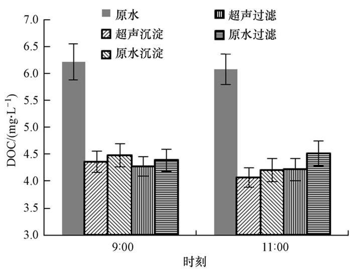 ¡¡¡¡ÔˮΪÑïÖÝÊÐijºþ²´Ë®£¬¾Í¶¼ÓŨÔåºóÔË®×ǶÈ269¡«299 NTU£¬Ôåϸ°û¸öÊý3.95¡«4.95ÒÚ¸ö¡¤ L-1£¬DOCΪ6.1¡«6.2 mg ¡¤ L-1.³¬Éù²¨Ë®´¦Àíϵͳ»ìÄý¼ÁͶ¼ÓÁ¿20 mg ¡¤ L-1£¬ÎÞ³¬Éù²¨ÏµÍ³»ìÄý¼ÁͶ¼ÓÁ¿25 mg ¡¤ L-1.¸÷ʱ¿Ì³ÁµíË®Ôåϸ°û¸öÊýºÍDOC·Ö±ð¼ûͼ 9ºÍͼ 10.