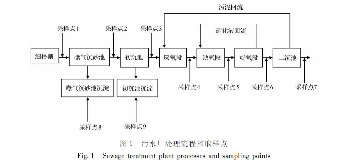 该实验所用水样取自西安市第五污水处理厂,该水厂采用A/A/O处理工艺,处理规模约每天20万t,生物池采用微孔曝气,有效水深8.0m,生物池水力停留时间16.5h(其中厌氧池2h,缺氧池5.5h,好氧池9h)。污水厂处理流程以及取样点如图1所示。此次研究选择细格栅出水作为系统总进水,二沉池出水作为总出水。