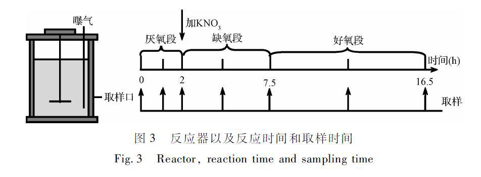 在恒温条件下分3个阶段运行,分别是厌氧条件下反应2h,缺氧条件下反应5.5h,好氧条件下反应9h,在反应过程中要持续搅拌。厌氧过程结束后(2h),向反应器中加入大约10mg/LKNO3,并且在好氧段开始时,打开曝气装置,使容器中溶解氧达到2mg/L以上,以模拟整个A/A/O处理过程。取样时间如图3所示,并用0.45μm滤膜过滤,测量TN、NH+4 -N、NO-3 -N和NO-2 -N。