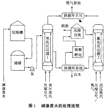 第二级为催化湿式氧化,温度控制在200℃~300℃之间,压力控制在5.0MPa左右,空气或者纯氧曝气,采用γ-Al2O3/CuO作催化剂进行催化湿式氧化。碱渣废水先经过沉降分离器除油后进入储罐,然后经泵加压送至一级缓和湿式氧化反应器,脱除硫化物;如果碱渣废水中含有可观的环烷酸和酚,可采用硫酸进行酸化回收,并且调节pH值;料液部分循环逐步进入二级催化湿式氧化反应器,对残留的酚及其它大部分CODcr进行降解。为维持反应温度和压力,套筒式反应塔夹层引入高压蒸汽调节温度,内部用空压机曝气,维持氧分压和总的操作压力。处理过程中的热量采用热交换装置进行回收利用。