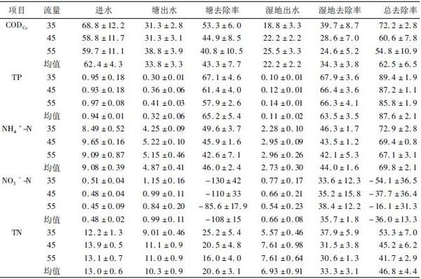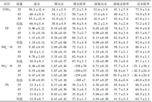 3种流量下的湿地出水的CODCr、TP、氨氮、TN均达到了《城镇污水处理厂污染物排放标准》(GB18918-2002)的一级A标准。3种流量下的湿地出水的CODCr、氨氮均符合《地表水环境质量标准》(GB3838-2002)中的Ⅲ类标准。湿地出水的TP在35L/h和45L/h这两种流量下都能达到Ⅱ类标准,而当流量加大到55L/h时出水中TP却只能达到Ⅲ类标准。因此,考虑到要兼顾提高出水水质和加大污水处理量这两方面,最终确定较优的系统污水处理量为45L/h,即塘与湿地的水力负荷分别为0.22、0.37m3/(m2•d)时系统具有较高的处理效率。