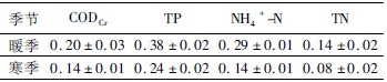 式中:Cin与Cout分别为进水和出水污染物浓度,mg/L;A为系统表面积,m2;Q为日流量,m3/d;K为去除速率常数,m/d。塘与湿地较优的水力负荷在暖季时分别为0.22、0.37m3/(m2•d),寒季时分别为0.17、0.29m3/(m2•d)。在这一较优水力负荷条件下,塘-湿地复合系统对CODCr、TP、NH4+-N和TN的去除速率常数K见表3。